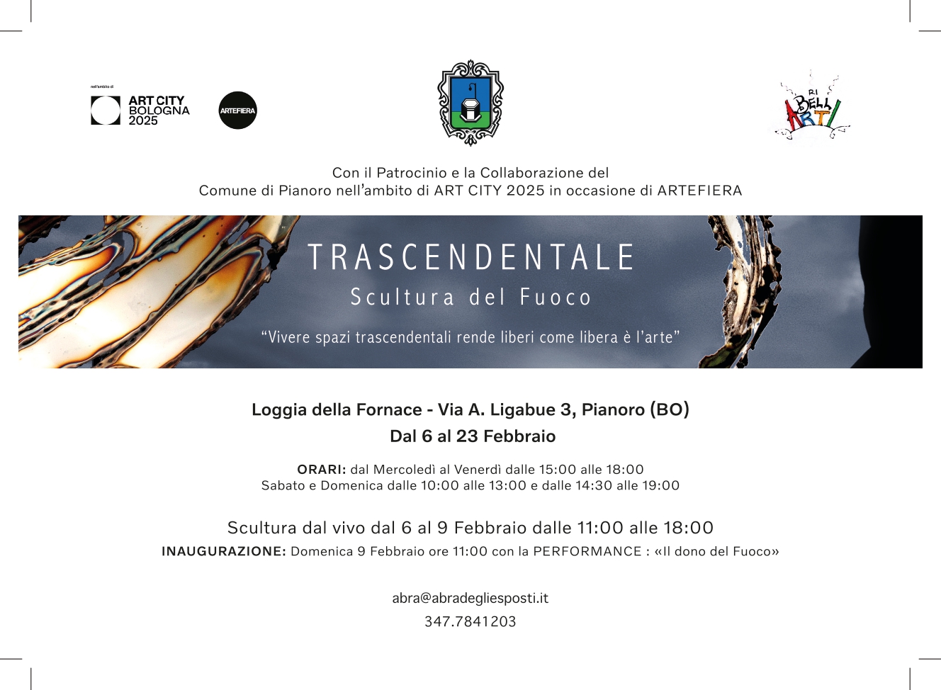 L’Associazione riBellArti propone a Pianoro, presso la Loggia della Fornace, il progetto dell’artista bolognese Abra Degli Esposti, in arte ABRA, «Trascendentale - Scultura del Fuoco» dal 6 al 23 febbraio. L’obiettivo dell’artista è quello di collegare il territorio metropolitano con il grande evento cittadino attraverso un’esposizione di opere ricca di eventi performativi che coinvolgono il pubblico.