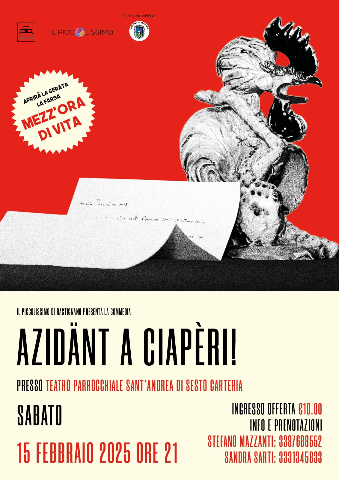 Sabato 15 febbraio 2025, dalle 21.00, presso il Teatro Parrocchiale di Carteria di Sesto, in via Nazionale 42, il Piccolissimo di Rastignano presenta la commedia teatrale "Azidant a ciapèri"