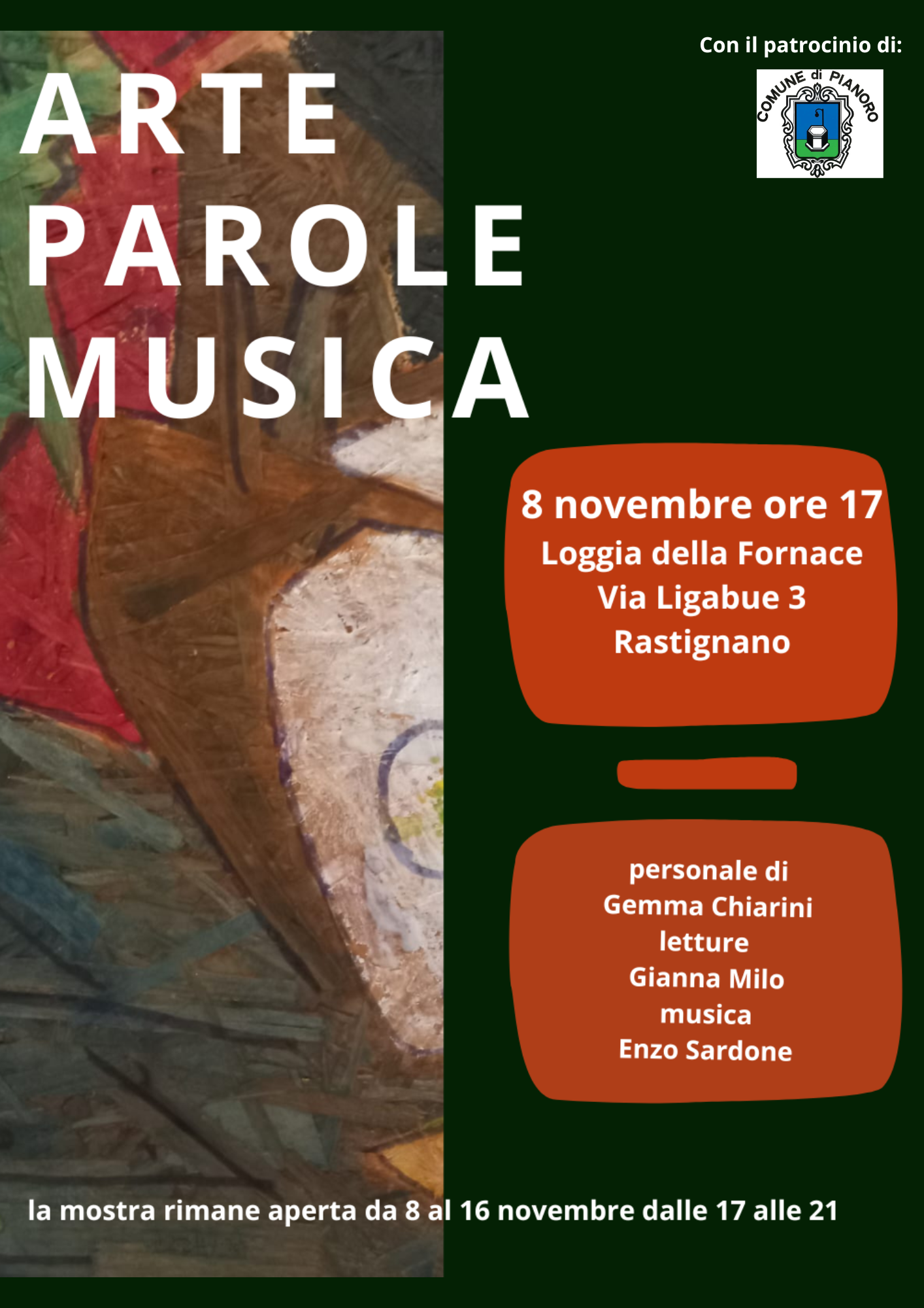 Arte, parole, musica sabato 08 novembre 2025 - domenica 16 novembre 2025 "Arte, parole e musica" dall'8 al 16 novembre dalle 17 alle 21 presso la Loggia della Fornace, via Ligabue 3, Rastignano - Pianoro L'artista Gemma Chiarini presenterà le sue opere inaugurando la mostra "Arte, parole e musica", l'8 novembre.La serata sarà accompagnata dalle letture di Gianna Milo e dalla musica di Enzo Sardone. categoria Mostre dove Loggia della Fornace quando inizio: sabato 08 novembre 2025 fine: domenica 16 novembre 2025