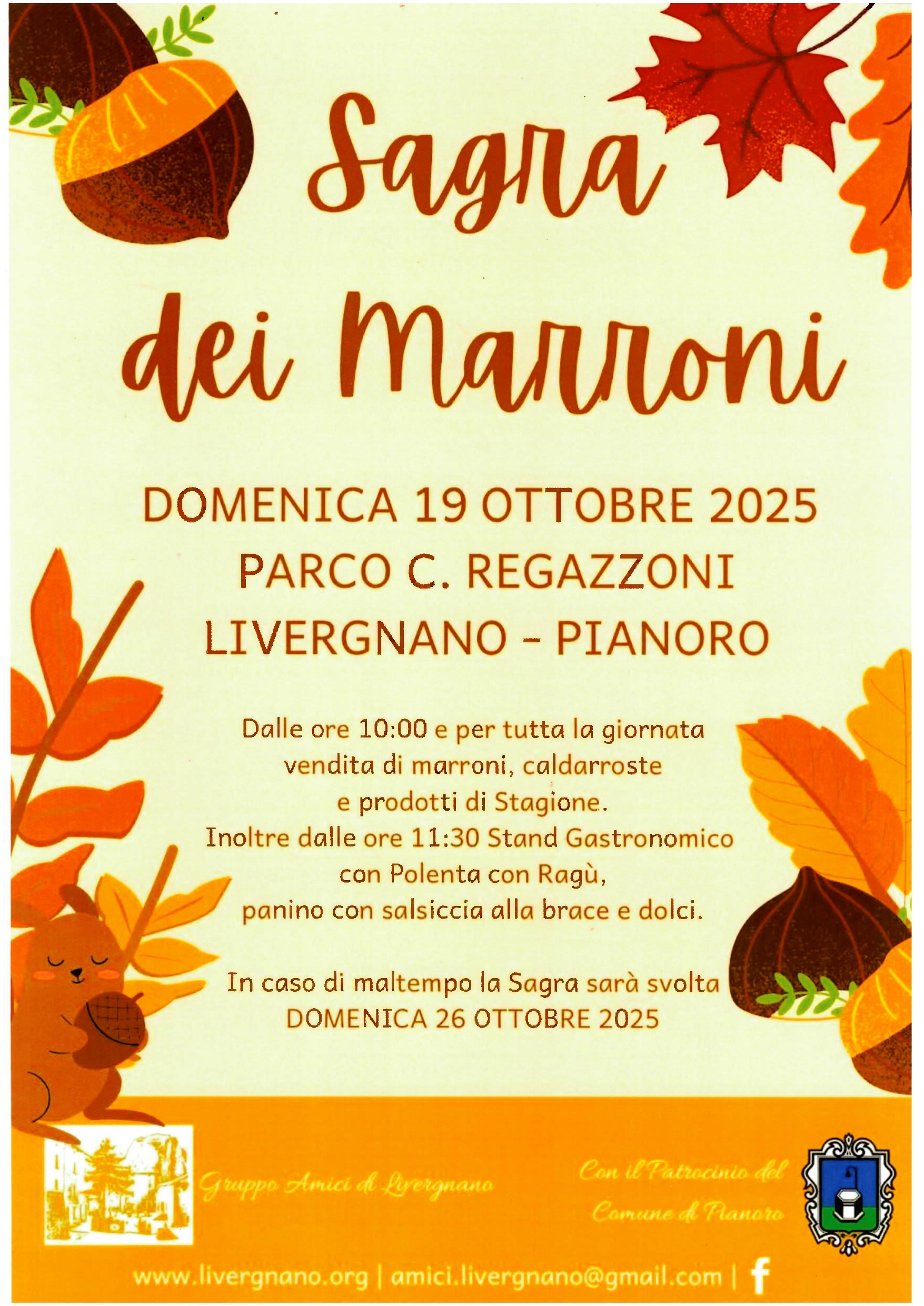 Domenica 19 ottobre 2025, presso il Parco C. Regazzoni di Livergnano, dalle ore 10.00: Sagra dei Marroni