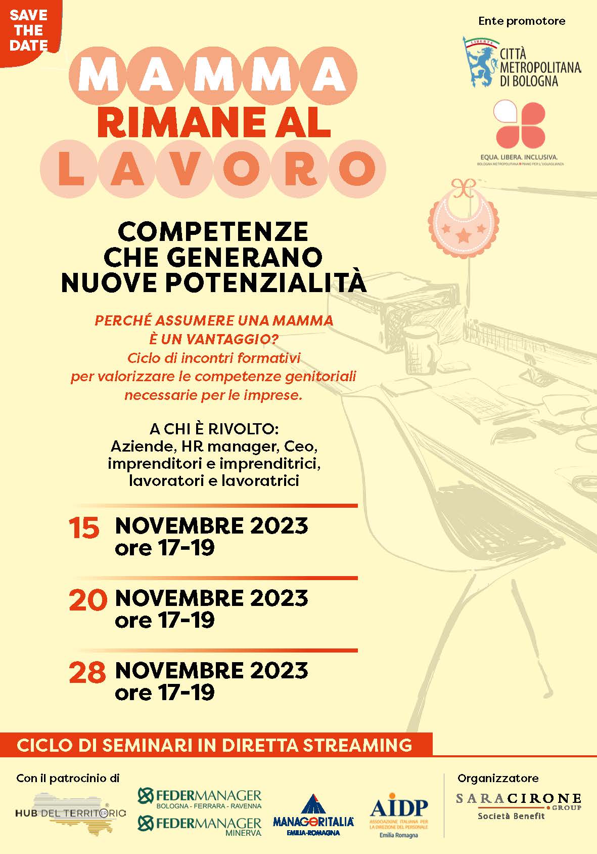 In collaborazione con Manageritalia, Federmanager, AIDP e Fondazione Hub del Territorio ER, organizzati tre incontri con esperte ed esperti, professioniste e professionisti, lavoratori e lavoratrici per mettere in evidenza come le competenze maturate quando si diventa genitori siano competenze solide da spendere anche nel mercato del lavoro e allo stesso tempo necessarie per imprese moderne e innovative.